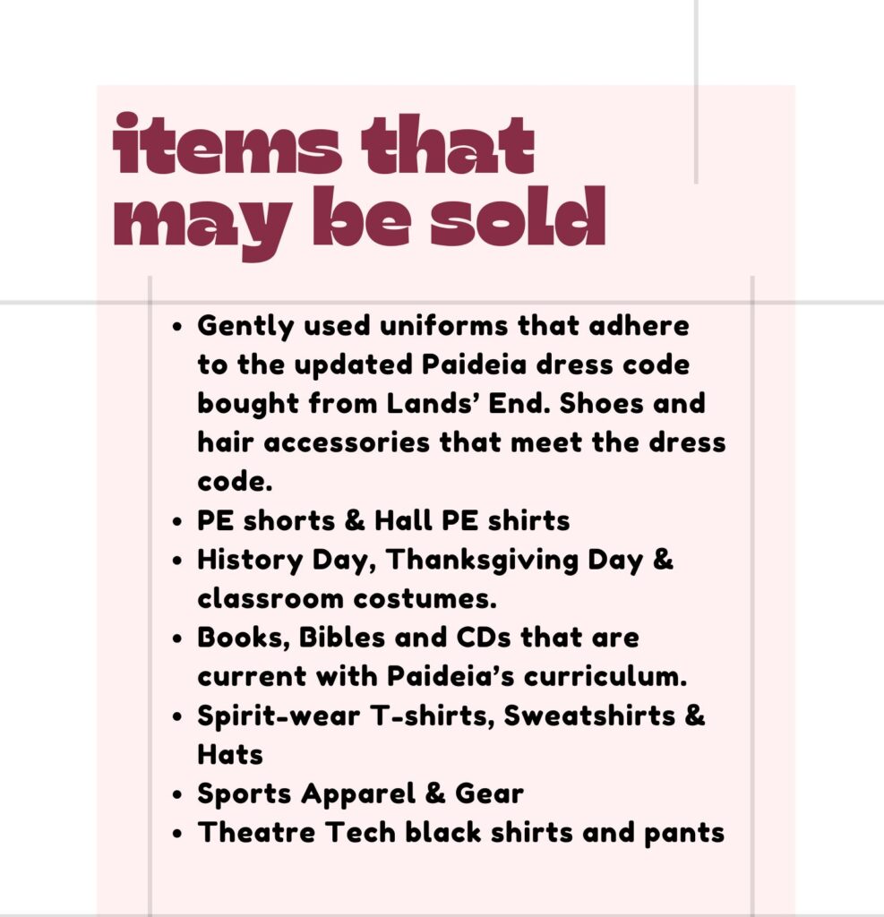 - If your item looks worn out or has stains or holes and you would not buy it, please do not consign it. We reserve the right to pull any items that are not in good condition or do not adhere to the school’s guidelines.